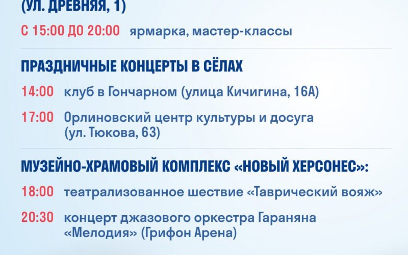 Праздничную программу подготовил и музейно-храмовый комплекс «Новый Херсонес». Здесь откроется обновленная экспозиция музея Крыма и Новороссии. Все желающие смогут поучаствовать в мастер-классах в «Точке опоры», насладиться театрализованным шествием «Таврический вояж» и выступлением ведущих коллективов страны на «Грифон Арене» в рамках «Большого фестиваля искусств».