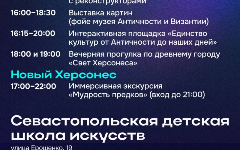 Программа праздника включает кинопоказы, выставки, спектакли, творческие встречи, экскурсии и мастер-классы. В музее-заповеднике «Херсонес Таврический» будут мастер-классы, выставка картин и интерактивные площадки. Музей Крыма и Новороссии представит иммерсивную экскурсию «Мудрость предков» с возможностью примерить доспехи, произнести клятву и оставить послание для России будущего.