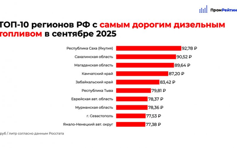 В десятке регионов с самым дорогим дизтопливом лидируют Республика Якутия (Саха), Сахалинская и Магаданская области. Севастополь в этом рейтинге на девятой строке.