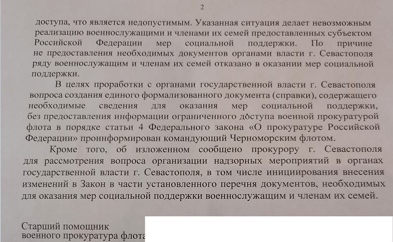 На основе выявленных вопиющих фактов нарушения прав членов семей военнослужащих, редакция ООО «Медиа Командер Групп» обратилась в военную прокуратуру Черноморского флота с просьбой взять ситуацию на контроль.
