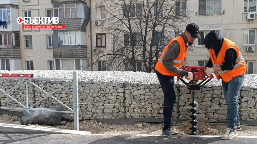 Основным объектом благоустройства стала подпорная стена, выполненная из коробчатых сетчатых габионов. Стена состоит из десяти уровней, два из которых расположены под землёй для усиления конструкции. Для строительства было использовано около двух тысяч тонн камней, которые были доставлены из Шархинского карьера под Алуштой и уложены вручную. Работы выполнены на 90%.