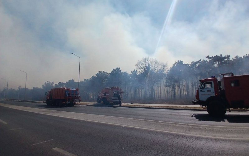 Сейчас все подразделения пожарной охраны Севастопольского гарнизона ведут тушение трёх больших очагов в районе Камышового шоссе, на участке от железнодорожного моста до Фиолентовского кольца.