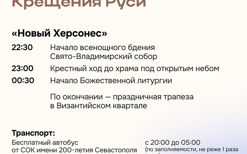 На День Крещения Руси время мероприятий к «Новому Херсонесу» будет ходить бесплатный автобус