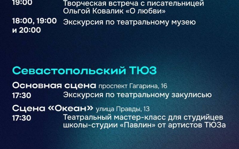 Программа праздника включает кинопоказы, выставки, спектакли, творческие встречи, экскурсии и мастер-классы. В музее-заповеднике «Херсонес Таврический» будут мастер-классы, выставка картин и интерактивные площадки. Музей Крыма и Новороссии представит иммерсивную экскурсию «Мудрость предков» с возможностью примерить доспехи, произнести клятву и оставить послание для России будущего.